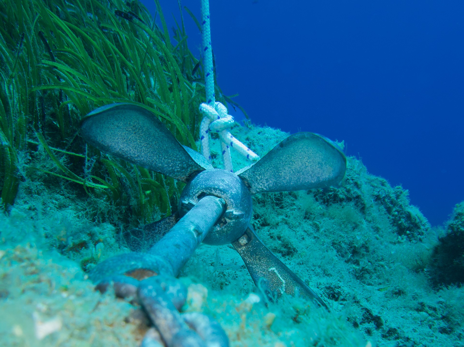 ▲ Folding grapnel anchor placed on rocky seabed